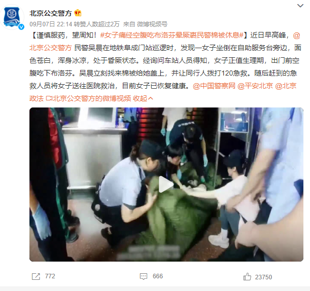 经询问车站人员得知,女子正值生理期,出门前空腹吃下布洛芬。